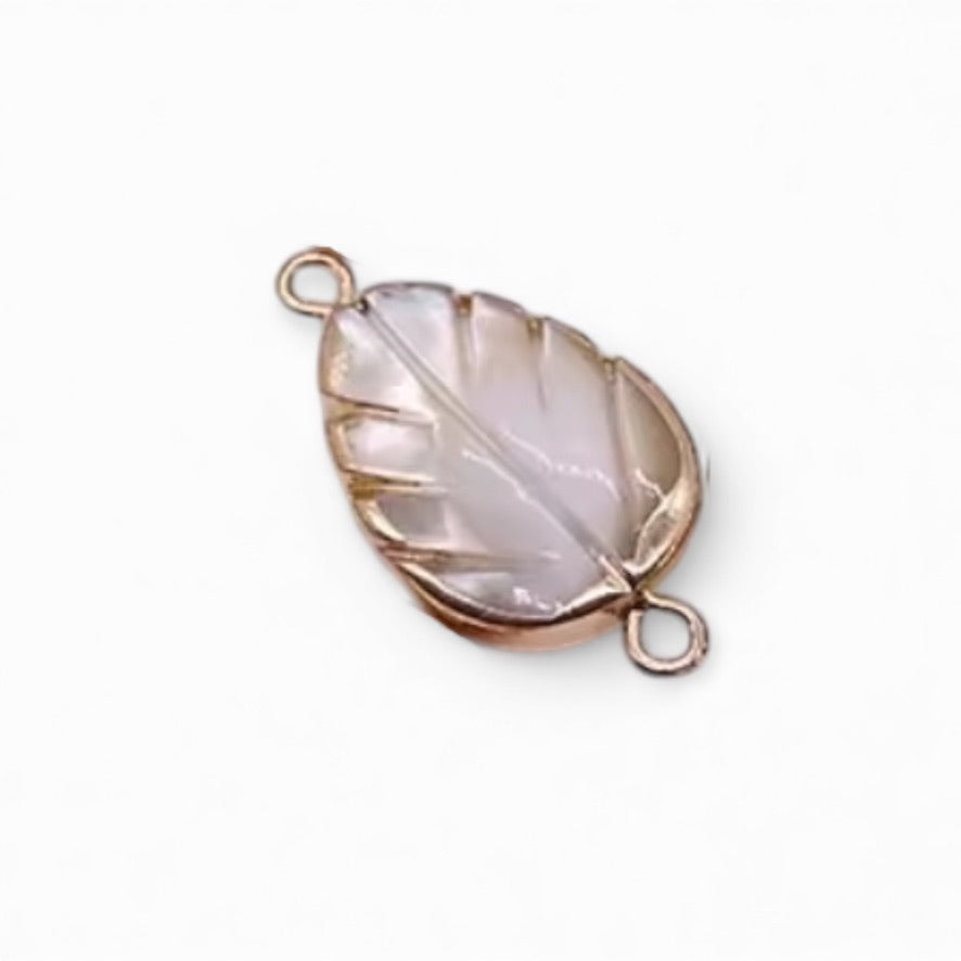 Dije conector en forma de hoja tallada en concha natural, perfecto para agregar un toque delicado y luminoso a pulseras o collares. Una pieza elegante y versátil para crear combinaciones únicas.